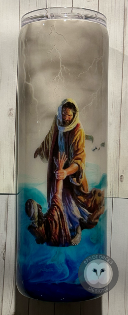 Jesus/stormy sea glowing ink swirl. 30 oz. skinny. Double wall stainless steel. Insulated. Comes with lid and a straw.