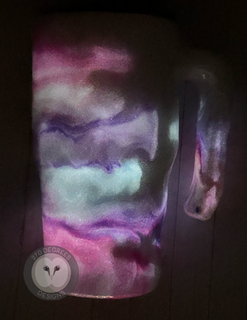 Pink and purple glowing ink swirl. 20 oz. curve tumbler with handle. Double wall stainless steel. Insulated. Comes with lid and a straw.