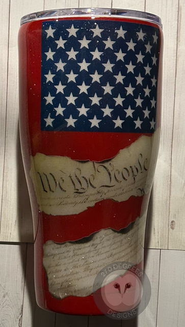 Flag and US Constitution. 30 oz. Modern Curve. Double-wall stainless steel. Vacuum Insulated. Comes with lid and straw.